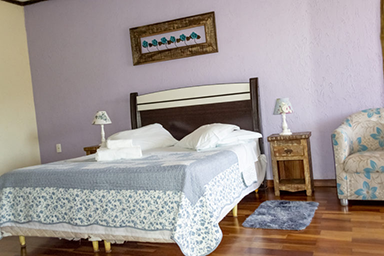 Nossa Suíte Master é um quarto duplo com banheira de hidromassagem, localizado no piso superior. Por questão de segurança, não permitimos crianças nesta acomodação que é acessível apenas por escadas, assim como a estrutura geográfica de nossa pousada exige o uso de escadas para acessar o salão de café e as áreas de lazer.